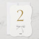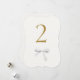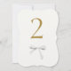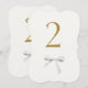 Chic and lovely. This wedding table number features a faux gold contemporary font and white watercolor ribbon detail, against an off white background. The front design is repeated at the back for easy view from all angles at the table.