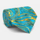 A tie with an abstract design featuring a wavy faux gold and turquoise blue pattern.
