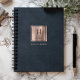This elegant planner features a digital background image in imitation of navy blue leather texture. Personalise it with your monogram initial in navy blue decorative font and your name in navy blue copperplate lettering on a rose gold faux brushed metal square, along with the year or other text of your choice in rose on the navy blue background.