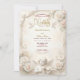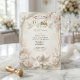 Announce your sacred union with the timeless grandeur of the Renaissance. This design features heavenly aesthetics and lush florals for a truly romantic tone.An intricate visual composition inspired by classical European architecture. The design showcases a faux sculptural relief effect, simulating the look of carved stone and architectural molding in soft champagne and beige tones. A central vignette features a delicate illustration of a cherub playing a violin, accompanied by white doves in flight and lush clusters of cream and blush roses. The background mimics a textured marble surface, while the typography simulates the sheen of gold leaf.This is a flat printed image with a faux stone and gold effect, not actual raised material, embossing, or metallic foil.