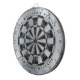 A classic dartboard design with alternating black marble and faux silver triangles. The outside circle is faux silver foil. There is a family name above and a message below, both in black arched text.