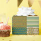 A roll of chic Giftwrap, with a Faux Patchwork pattern of tribal patterns, stripes and polka dots in Green, Rusty Red, Navy Blue and Old Gold; from the Posh & Painterly 'Jungle Drums" collection.