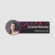This professional name tag features a name in white on the faux pink sparkle background and the title in white over a black background below with a template photo in the circle on the left. Personalize the text fields or click customize to select a font style, size, and color you prefer. Replace the placeholder photo with yours. A close-up square photograph works best. You can also add this design, where it fits appropriately, to one of the products shown in the transfer scroll bar on this page like the bag tag.