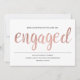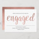 This engagement invitation features a hand-lettered look brush script type with a faux rose gold foil texture.
