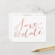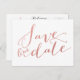 Printed Faux Rose Gold Foil Glamour | Wedding Save our Date Postcard. Elke Clarke © Other colours available at www.zazzle.com/monogramgallery. A simple, yet versatile, handwritten script rose gold save the date for weddings or other special occasions such as rehearsal dinners, couple's showers, wedding anniversary celebrations. Rose gold foil is a printed photo effect.