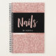 This glam, stylish business planner for nail technicians features a faux rose gold glitter look (please note this is not actual glitter, but only an image) and a black centre frame with matching modern handwritten script that says "nails."