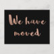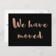 This elegant, stylish postcard says "we have moved" in trendy, faux rose gold script typography. The back of the postcard has plenty of room for a message and your new address.