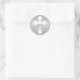 This 1.5" diameter round faux silver First Holy Communion sticker or envelope seal has a decorative white glowing Cross and faux embossed look silver lettering that matches the 1st Communion invitation shown below.