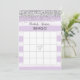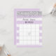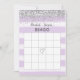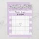 Bridal shower bingo card with faux silver glitter design and light purple stripes watercolor background.