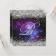 Faux silver glitter with sparkles against a black, purple and blue celestial space photo.
