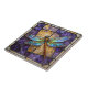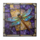 Add a touch of vintage elegance to your home décor with this stunning faux stained glass dragonfly design. This artistic tile features a magnificent dragonfly with intricate, iridescent blue and teal wings, resting against a fractured mosaic background of deep violet purple and glowing amber gold. The artwork mimics the classic texture and leaded lines of art Nouveau glass, creating a rich, jewel-toned aesthetic.