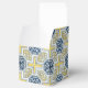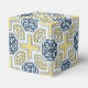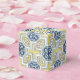 A faux tile party favour box with a vintage, geometric tile art pattern with flowers and leaves in blue, white and yellow, with a handpainted feel. Click Customise It to add your name or message, change background colours, even save your design for later.