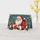 Faux vintage illustration with Santa Claus and small deers. Design on horizontal greeting card with wishes inside.