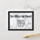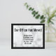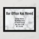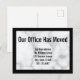 Display text says ' Our office has moved'. Customise your postcard with your company's name, new address, and phone number. The background is has a white marble look. The postcard has a black border.