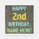 This fun birthday party napkin design features a message like "HAPPY 2nd BIRTHDAY, NAME-HERE!", where the name can be personalised. The background features a rustic, brown, faux wood grain appearance pattern. The personalised message text features colours like blue, yellow, and green, and it has an appearance inspired by that of painted, stenciled lettering. Napkins like these could perhaps be used at a birthday party for somebody who is celebrating their second birthday. [~Z0000292]