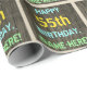 This fun birthday-themed wrapping paper design features a message like "HAPPY 55th BIRTHDAY, NAME-HERE!", where the name can be personalised. The background features a rustic, brown, faux wood grain appearance pattern. The personalised message text features colours like blue, yellow, and green, and it has an appearance inspired by that of painted, stenciled lettering. Wrapping paper like this could perhaps be used when wrapping birthday gifts being given to somebody who is celebrating their fifty fifth birthday. [~Z0000293]