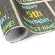 This fun birthday-themed wrapping paper design features a message like "HAPPY 5th BIRTHDAY, FIRST-NAME!", where the name can be personalised. The background features a rustic, brown, faux wood grain appearance pattern. The personalised message text features colours like blue, yellow, and green, and it has an appearance inspired by that of painted, stenciled lettering. Wrapping paper like this could perhaps be used when wrapping birthday gifts being given to somebody who is celebrating their fifth birthday. [~Z0000293]