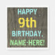 This fun birthday party napkin design features a message like "HAPPY 9th BIRTHDAY, NAME-HERE!", where the name can be personalised. The background features a rustic, brown, faux wood grain appearance pattern. The personalised message text features colours like blue, yellow, and green, and it has an appearance inspired by that of painted, stenciled lettering. Napkins like these could perhaps be used at a birthday party for somebody who is celebrating their ninth birthday. [~Z0000292]