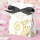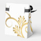 Shown is a tent style favor box in White with a fancy Golden-color printed heart pattern on it and floral-type print all over box. Embellished with a black ribbon bow at top. Newlyweds' names on each side of heart and the last name inside the heart.