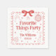 These festive napkins feature a minimalist red line-art design with a charming bow, curly ribbon frame, and holiday icons like champagne glasses, a cocoa mug, ornaments, and a sparkling bottle. The center layout highlights “Favorite Things Party” with customizable host name and event date. Perfect for Christmas gatherings, favorite-things exchanges, office parties, and winter celebrations, these napkins bring a warm, coordinated red-and-white holiday look to your table.
