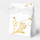 Shown is a tent style favour box in White with a fancy gold floral printed pattern on it. Embellished with a White ribbon at top. Customise this item or buy as shown.