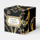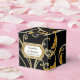 NOTE: This is a flat printed image, there are no jewels, raised layers or gold metallic elements. COLOR PALETTE: black, soft creamy white with faux gold metallic glitter look DESIGN COLLECTION: Matching formal dinner reception, bridal shower or rehearsal dinner favour boxes for easy decor enhancement. Inspired by Old Hollywood and her heyday glam era, this wedding invitation set is perfect for elegant, sophisticated, modern wedding celebrations. A classic, beautiful swirling leaf damask style pattern has been graphically designed to look like a silver edged gold glittery embroidered lace design with a golden buckle that has a diamond border over faux glitter. A contemporary typography layout for your invite wording and information updates this vintage retro design. A gorgeous, unique and pretty design for the most discriminating bride.