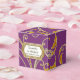 NOTE: This is a flat printed image, there are no jewels, raised layers or gold metallic elements. COLOR PALETTE: violet purple, soft creamy white with faux gold metallic glitter look DESIGN COLLECTION: Matching formal dinner reception, bridal shower or rehearsal dinner favour boxes for easy decor enhancement. Inspired by Old Hollywood and her heyday glam era, this wedding invitation set is perfect for elegant, sophisticated, modern wedding celebrations. A classic, beautiful swirling leaf damask style pattern has been graphically designed to look like a silver edged gold glittery embroidered lace design with a golden buckle that has a diamond border over faux glitter. A contemporary typography layout for your invite wording and information updates this vintage retro design. A gorgeous, unique and pretty design for the most discriminating bride.