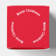 Elf with sack of gifts, stands within circle of red text on front and back.On sides is an tree designed with green lines. On top, top has circled text only. Circle repeats "Merry Christmas" three times in white. Background is red.