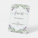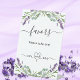 White elegant background, decorated with lavender florals, flowers and eucalyptus greenery. Text: Favours, please take one. Mr and Mrs with a heart.
