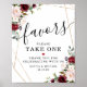 Florals with burgundy and pink blush bouquet and gold geometric shape framing script "favours" and classic typography "please take one" for wedding sign.
