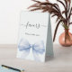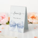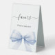 White elegant background, decorated with a large blue bow.  Text: Favours. Please take one!