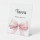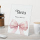 White elegant background, decorated with a large pink bow. Text: Favours. Please take one!