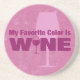 Wine theme coaster says MY FAVORITE COLOR IS WINE. The "i" in "wine" is a wine glass. Distressed background and moveable/sizeable wine glass. Perfect gift for wine lovers, wine tasters and wine divas. Add your own personal message! Also on T-shirts, aprons, caps tote bags, note cards, magnets, ornaments and more! PinkInkArt original!