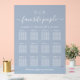 Chic dusty blue frosted acrylic wedding seating chart sign for up to 12 tables featuring "Our Favourite People" in simple white typography and an elegant white script with swashes, "We're so glad you're here," and your names and wedding date joined together by a heart.