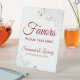 This pretty tabletop sign is designed to invite your guests to take a wedding favour. It features a simple yet elegant design with fancy crimson red script lettering and delicate silver faux foil curls and swirls in the corners. The sign reads: Favours, Please take one! There is room for your names and the wedding date below.