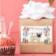 Destei's original cartoon illustration of a cute fawn coat colour Pug breed dog. The dog is placed in a colourful birthday setting with pastel colour birthday balloons, gifts and a bunting banner. The pastel colours include pink, green, blue, red, orange and purple. The dog is standing on a yellow wood floor texture and the background has a playful pastel colour polka dot pattern.