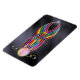 A brilliantly-coloured flowing abstract framed in gold and studded with diamonds and pearls. Sinuous glowing streams of red, yellow, green, blue, purple, and pink curve smoothly, crisscrossing from one great pearl down to the tip, accented at the end by a starburst. This rainbow design is laid against a background of black silk.