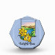 Wish a very happy and blessed St. David's Day with this wonderful illustration of a landscape with mountains and a river behind two beautiful yellow daffodil flowers. A great gift item to send blessings on the Feast of St. David.