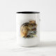 This cute little chipmunk is stuffing his cheeks as fast as he can on a snowy day..