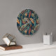 This semi-abstract pattern clock features swirls of feathers, flowers, and paisley like shapes n dusty teal, terra cotta, rust, deep blue green, tan, and cream. This vintage style print would fit a variety of decor colours and styles, with a pattern with bold swirls in muted tones. The design features silver tone hands, and is available on different sizes of clocks.