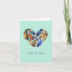 A thank you card with a watercolor design of feathers in a heart shape. Colours include yellow, orange, blue, green and brown. Some have stripes, dots, tribal patterns and other unique creative decorative arrangements. Set on a mint green background. Thank you message inside can be customised or personalised to suit your style.