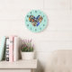 A cute clock with a watercolor design of feather in a heart shape. Colours include yellow, orange, blue, green and brown. Some have stripes, dots, tribal patterns and other unique creative decorative arrangements. Set on a mint green background.