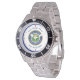 Has heft and feel of expensive stainless steel quartz watches. Good band with safety catch. I removed links, which is easy because engraved arrows show direction to push the linking pins. As always by this seller, the image (a railroad logo) is a perfect reproduction of my emailed image, and is precisely spaced and aligned.
