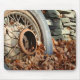 An old Federal Pennant tire and wheel leaning against a stone wall in November.