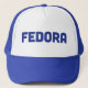 FEDORA fun and ironic slogan on trucker hat, blue, funny typographic statement, inspired by tv comedy character frank rossitano.
