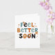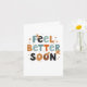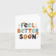 This 'get well' greeting card features a cheerful and colourful message that reads "feel Better Soon." The playful, handwritten-style font adds a personal touch, with letters varying in size and colours like light blue, black, orange, and brown. Small band-aid illustrations accompany each word, dotted around the letters on the card. The band-aids are a cute touch, with beige colouring and brown spots. Overall, this card shows warmth and positivity, perfect for sending healing vibes to a loved one in need. 🩹🧡