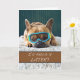 Pet-themed feel better soon paper greeting card with a dog-tired French Bulldog lying down on a shag rug and not ready to fetch quite yet. Customise the message inside the card as you like before checkout. Photograph of a cute French Bulldog with spiked collar and water goggles. Design and verse copyright © Shoaff Ballanger Studios, 2021.