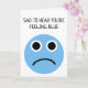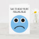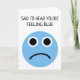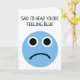 Know someone who's feeling sad. Let them know you're thinking of them with this cute card featuring a blue sad face emoji or emoticon. The message on the front and the inside of this card is ready to be personalized with your own saying or it can be left as is. The front reads "SAD TO HEAR YOU'RE FEELING BLUE" and the inside message reads "JUST WANTED TO LET YOU KNOW THAT I'M THINKING OF YOU" This blue sad face or emoji face is perfect for sending a boost to someone who is feeling down.