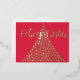 The Felices Fiestas Script Holiday Postcard design features a tree with golden flakes, the image features a simple yet elegant gold and red design which can be used by anyone during the holiday season.