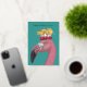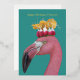flamingo wearing a birthday hat of radishes and a chanterelle mushroom